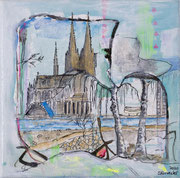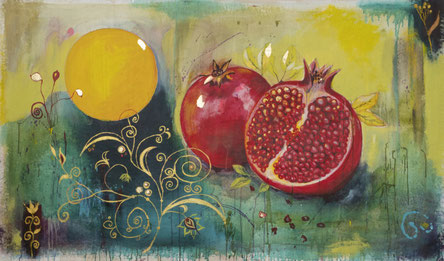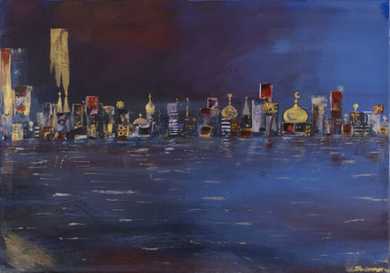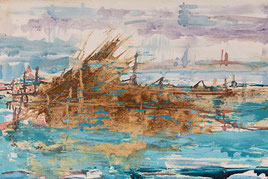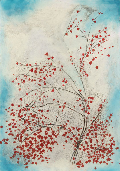 Acryl, Vergoldung, Collage, Kreide und Tusche auf Leinwand
