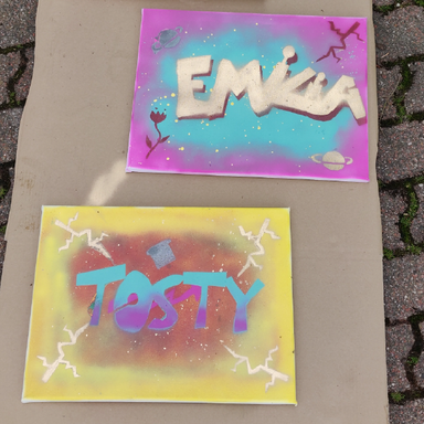 Dazu erstellen wir zuerst die Stencils mithilfe von Cuttern. Danach werden die Hintergründe mit Sprayfarbe gestaltet. Auf diesen Hintergrund sprühen wir dann mit Graffiti-Spray unsere Objekte, die wir zum Schluss noch mit Schatten oder anderen Effects versehen. Der Workshop kann bei Ihnen zuhause durchgeführt werden, wenn Garten oder Garageneinfahrt zur Verfügung stehen.